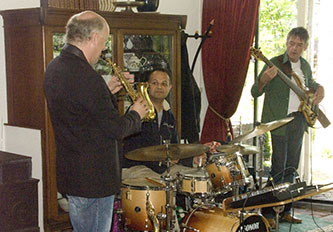 3 juli ; Milestones, 12 man en het gehele concert buiten! Swingend en meeslepend, het publiek genoot.